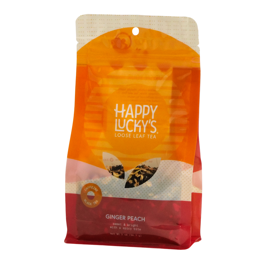 Happy Lucky's Ginger Peach black tea is a fragrant and hearty blend that makes a heartwarming hot brew and when iced, it's a backyard barbeque favorite.