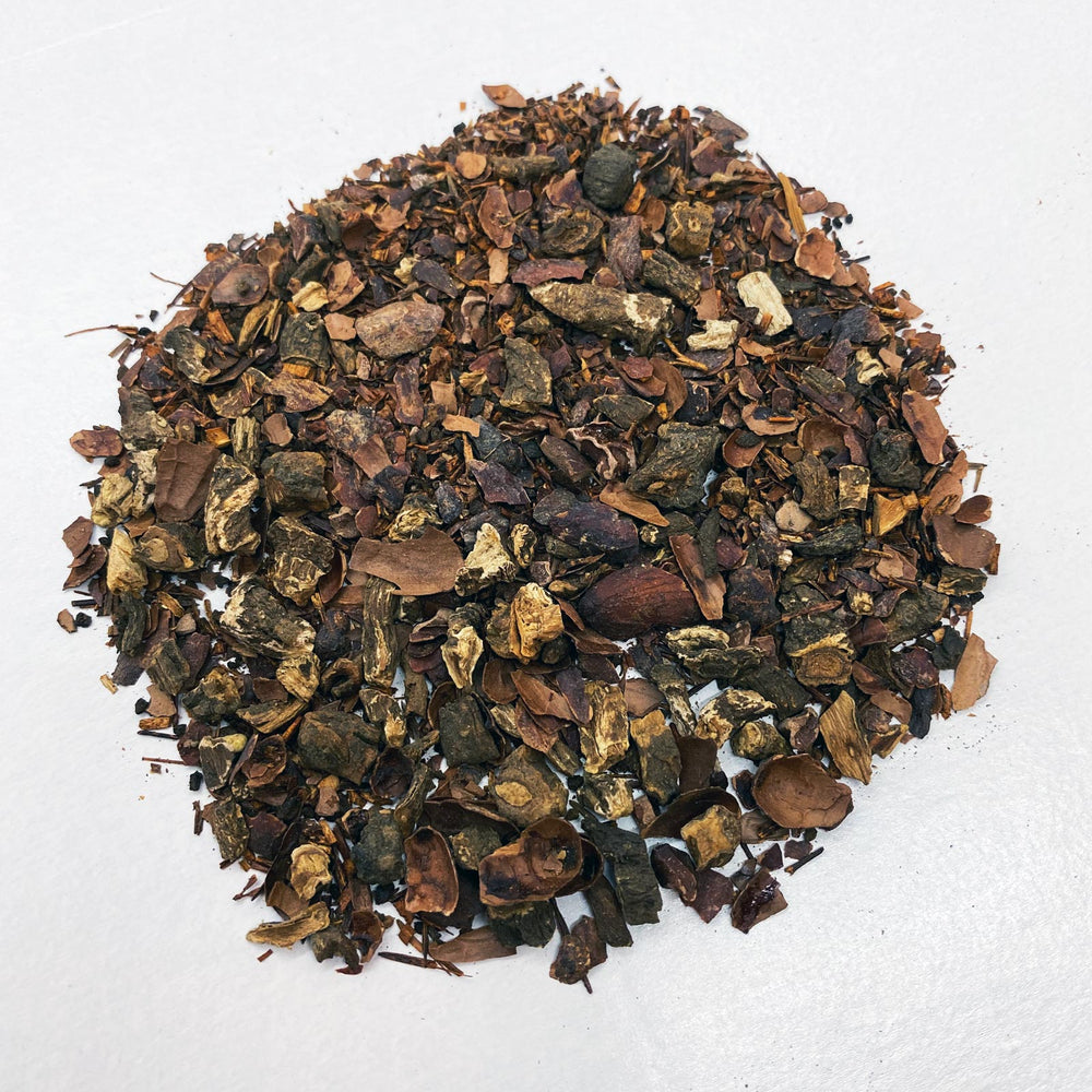 Faux Coffee is a fun play on traditional coffee substitutes. Our blend contains a mix of coffee leaves, organic Cacao Hulls, Rooibos Vanilla, Rooibos Chocolate Orange, as well as the roasted roots of dandelion and chicory. The taste is chocolaty and nutty, with a thick and creamy mouth-feel. Contains Soy